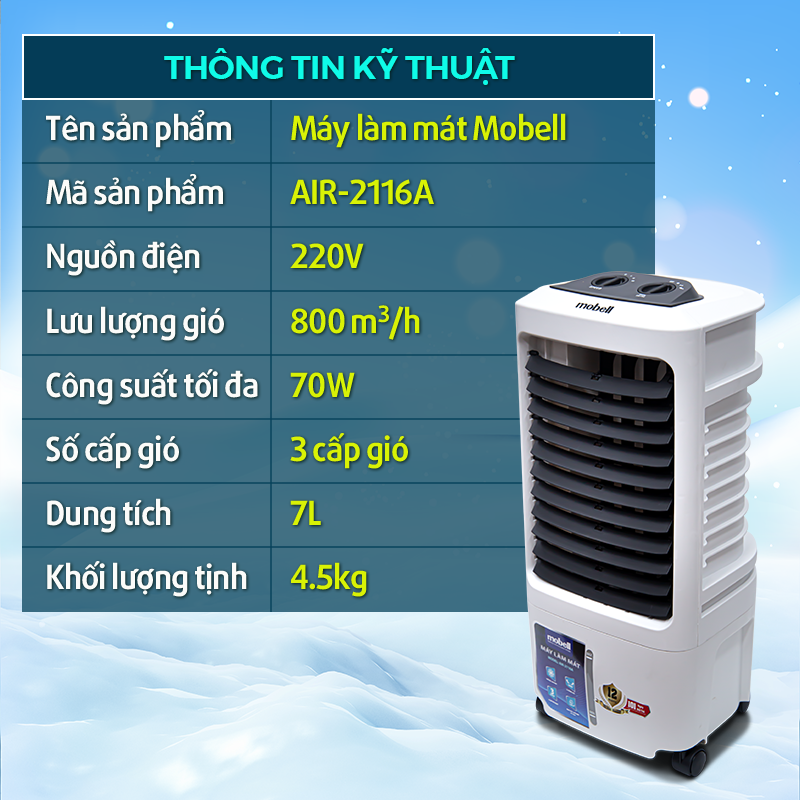 Miễn phí đổi trả nếu bán hàng kém chất lượng. Hiện tại Quạt điều hòa không khí siêu mát Mobell AIR-2116A - Công suất 90W- Dung tích 8L-Bảo hành lên đến 12 tháng. đang được giảm giá chỉ còn 1,106,700đ. Số lượng có hạn hãy nhanh tay đặt khi còn hàng bạn nhé